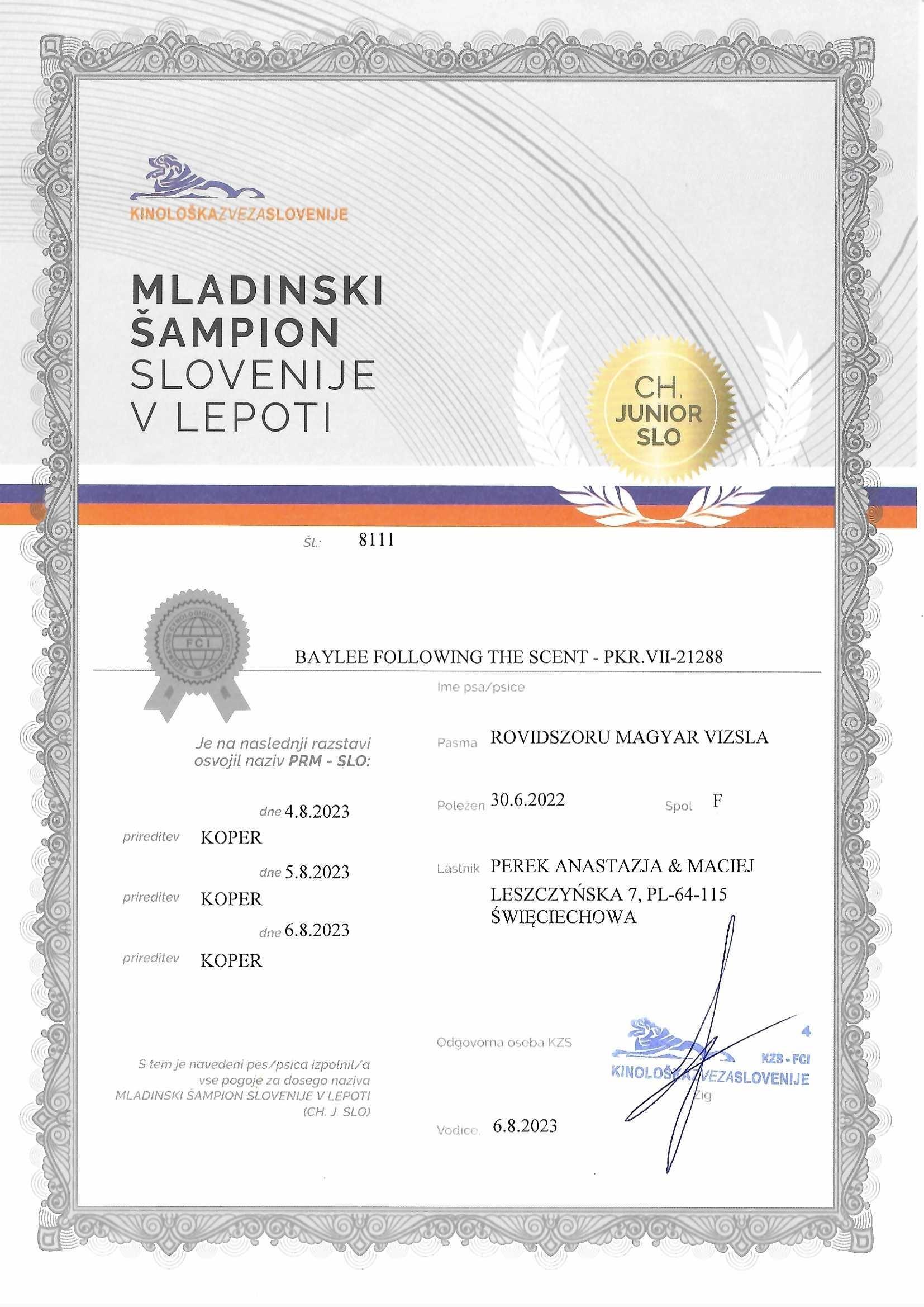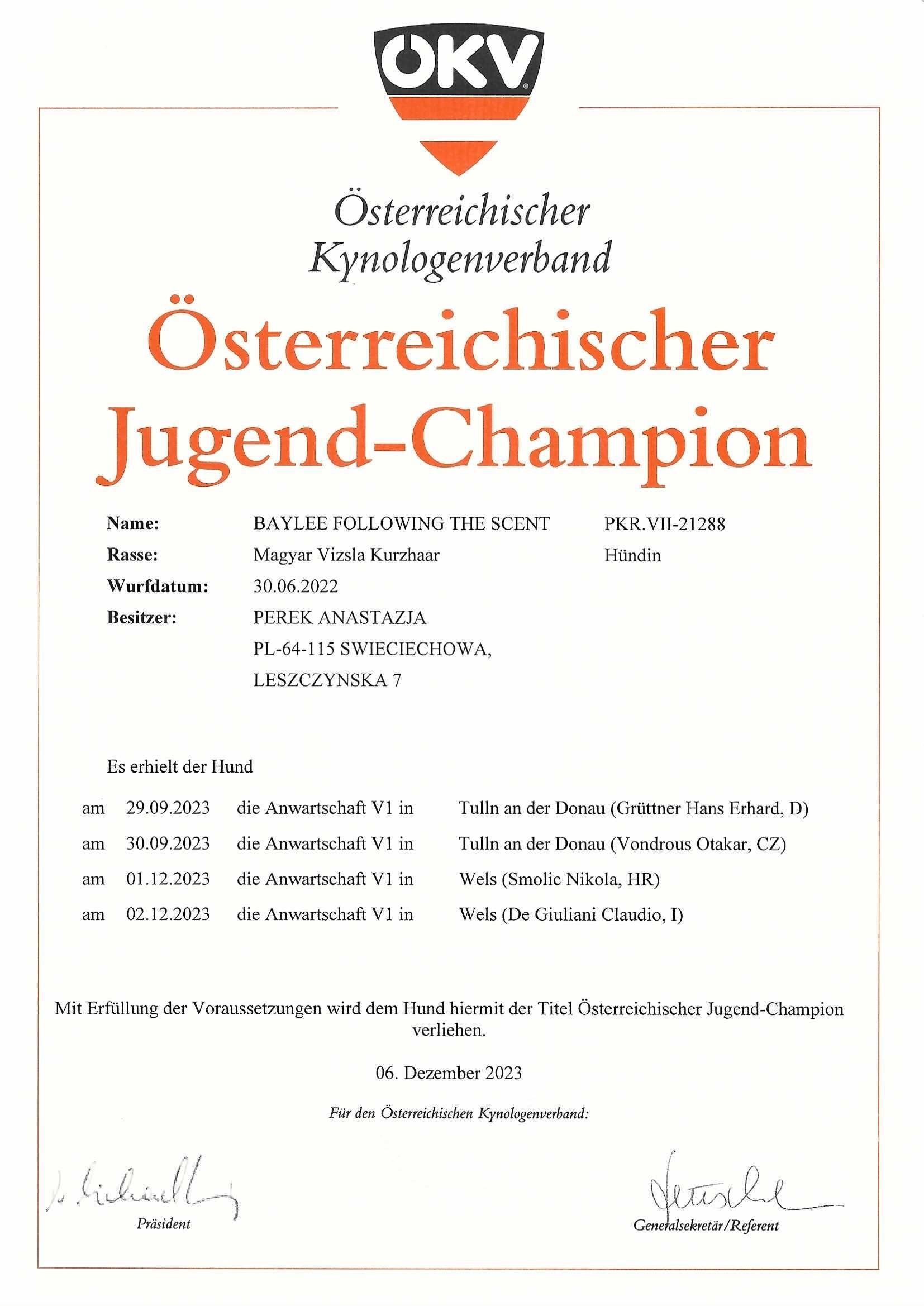 Międzynarodowa Młodzieżowa Championka Piękności (C.I.B.-J), Championka wielu krajów, regularnie doceniana przez sędziów w kraju i za granicą.